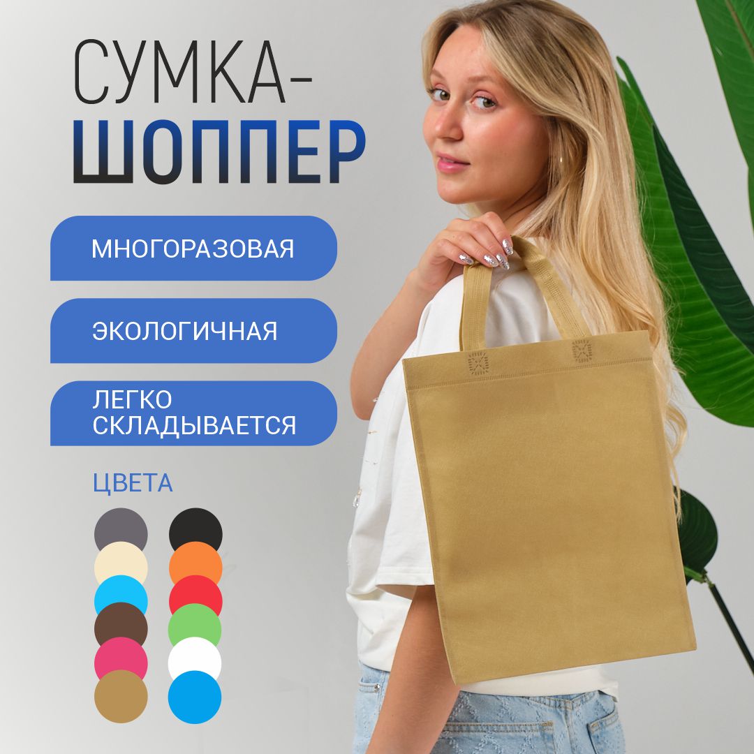 Многоразовый шоппер из нетканого материала с надежными пришивными ручками. Сумка из спанбонда приятная на ощупь, легкая и компактная.