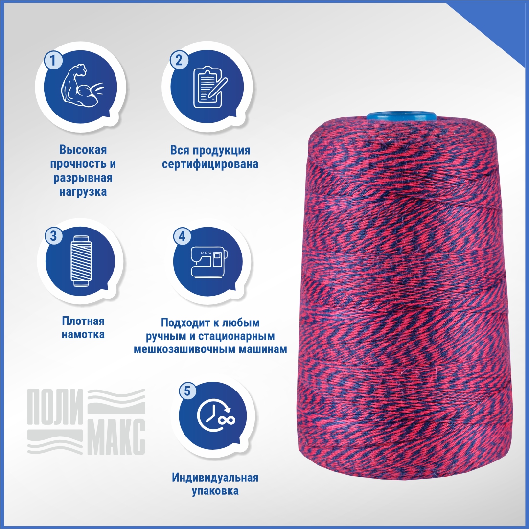 В компании «Полимакс» представлены сине-красные мешкозашивочные нити из 100% полиэстера. Ими фиксируют горловины мешков для защиты содержимого от влаги, мусора, просыпания во время транспортировки.