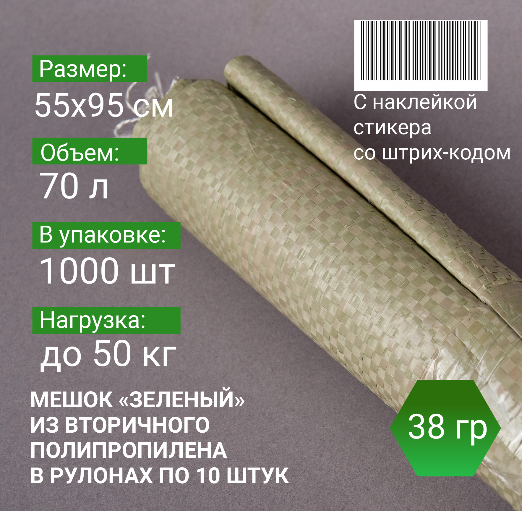 —Мешок п/п зеленый 50 кг, 55x95, 38г, рулоны по 10 шт. со стикером